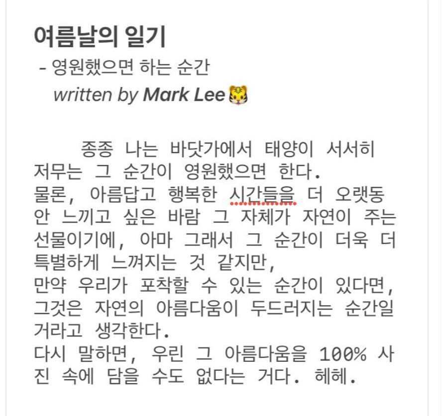 근데 마크가 이런 글을 쓴적이 있었다는걸 오늘 처음 알았음.....진짜 이것때문에 더 좋아짐...너무 좋아서 그만 좋아하고싶을정도로 좋아서 유해하다는 생각이 들정도로 좋음.......좋아하는데도 기력을 쓰니까 너무 피곤하다..안그래도 피곤한데......