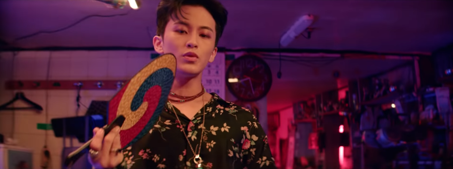 1. 스무살 된 마크의 흑발 오대오 쉼표머리 + 꽃무늬 블랙실크셔츠